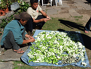 | これはさっきの? ブルーシートの上には 先ほどお店で見た 緑色の野菜が並んでいて 男性は、中の種を取り出していた 中野さんはディビさんに 「これを茹でて和え物にしたら」 ・・・と、話していた (後日、本当にその料理が出た) ツチェカレラ・・・という名前だそうだ |