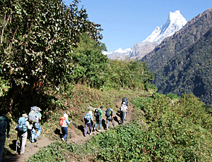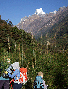谷沿いの道を マチャプチャレの尻尾を見ながら 谷沿いの道を歩く 谷はかなり深い |