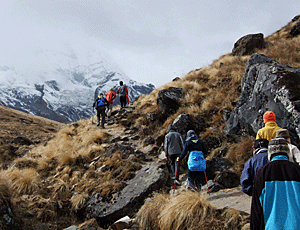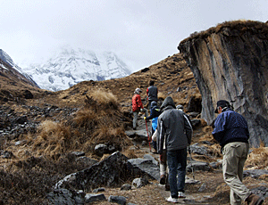 MBCへ ゲスト・ハウスが立ち並んでいる中を ゆっくり進む モディ・コーラを右に見て 緩やかな登り 3300m程だが、まだ大丈夫 |