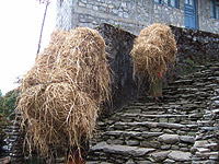 | 炊事場-1 ゲストハウスでは部屋に泊まるだけ 少人数のトレッキングの場合は ゲストハウスのメニューを見て その中から注文して食べるようだが 日本人パーティーの場合は 炊事道具・食材などを運び上げて こんな屋外の炊事場で作り トレッカーに提供するスタイルが 多い・・・と聞いた |
