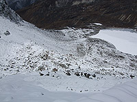 ドゥドゥ・ポカリ沿いに ゴーキョ・ピークの山腹をトラバースして ゴーキョ・ピークとたった20mしか 違わない、レンジョ・パスへ登っていく ドゥドゥ・ポカリの後ろに聳えるのは ソラチェ&タウチェ 年配のキッチン・スタッフが 高山病に罹ったと聞いた 彼は、レンジョ・パスを超えて 荷物を運んでくれるらしい 咳がひどいと聞いたが そんな体で大きな荷物を持って 5340mを越すのは大変だろうに・・・ |