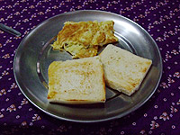 | ヌードル パン(ピーナツバターが好きなので いつもつけていた) オムレツ 青野菜の炒め物(硬かった・・・) |