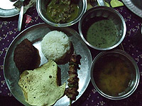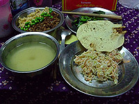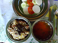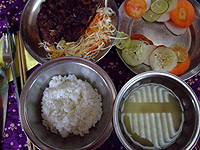 ごはん スープ バフ(水牛)・カツ (バフと聞いて恐る恐る口にしたが 少々硬いところがあっただけで 柔らかくておいしかった) 千切りキャベツ 生野菜(にんじん・大根・ きゅうり・みかん) |