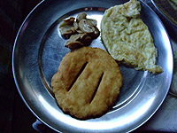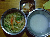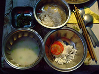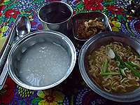 早朝出発なので 簡単にできる物・・・と聞いていたが 卵入りおかゆと マカロニ・スープの 暖かい食事で元気が出た! |