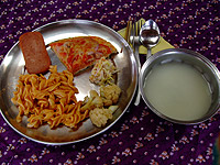 | おかゆ ヌードル チーズ(ヤクのチーズ)・オムレツ ホット野菜サンド(パンが 柔らかくなっていて食べやすい) キムチ |
