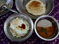 | 半熟卵かけご飯 パンケーキ 味噌汁 |
