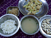 ごはん ダルトバート・カレー (ご飯を半分ずつ2種類の器に入れて 食べると、喉通りがいい) 味噌汁 ほうれん草のお浸し |