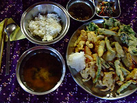 ごはん 味噌汁 酢の物 野菜のてんぷら大盛り (この大盛りは2人分だが かりっと揚がった、揚げたてで とてもおいしかった みんな食べたいくらいおいしかったが 油の量が心配で我慢して残した) 天つゆ(大根おろし・おろし生姜) |