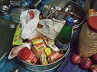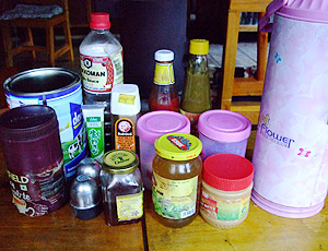 | 飲み物 | 行動中の水は、キッチン・スタッフが沸かしたお湯を貰って(ポカリスエットの粉末を入れて)飲んでいた。 とにかく高山病予防には水を飲むこと・・・と、先回何度も聞いていたので、いつも意識して (喉が渇かなくても、休憩中は必ず、トイレへ行ったら必ず)飲むようにしていた。 食事の前には、お湯のポットと、コーヒー・紅茶などの飲み物が自由に飲めるようセットして 置いてあるので、ブラック・ティーやミルク・ティーにして、かなりの量を飲んだ。 出発前に、日本茶は用意されていないと聞いていたので、煎茶とほうじ茶をたくさん持っていった。 いつも飲みなれているお茶は、気分が和む。 |