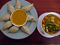| ディビさんのお店で 1人でまた出かけた ベジタブル・カレー ベジタブル・モモ (ぎょうざの巻き方が面白い 黄色いタレは、 あまり辛くなくてよかった) ミルク・ティー |
