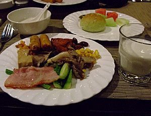 | ミンシャンホテルの朝食 中華オンリーのビュッフェでないのが 嬉しい 各種のパン・飲み物など あれこれ迷うほど多い |