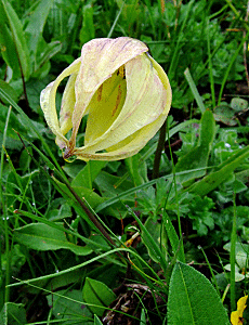 ユリ科:リリウム・ロフォフォルム-2 花びらの黄色が 赤っぽくなり始めているが まだ花びらの先はくっついたまま |