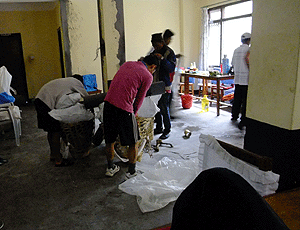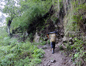 | 出発の準備をするポーターたち おかげでトレッカーは 雨具と傘と、 次のランチ場所までに必要な飲料水と トイレットペーパーとカメラと ファーストエイドキットとキャンディー程度の 必要なものだけを持って楽々歩くことができる |
