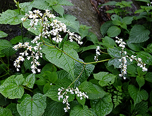| 樹林の木陰・湿っぽい岩の苔の上に咲いていた 葉っぱが大きい割りに、花は小さい ![]() ↑花のアップ |