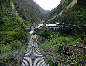 | 川が二股に分かれている この2つの川を吊橋で渡って 右側のランタン谷へ入っていく 左側の川は、チベットから流れてくる |