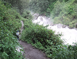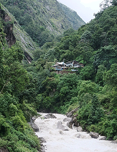 ランタン・コーラ 土色(というか泥色)の川が 渦巻き逆巻き恐ろしいほどの水量で流れている (帰途、水流で登山道の土がえぐられ 登山道が消失してしまった場所もあった) |