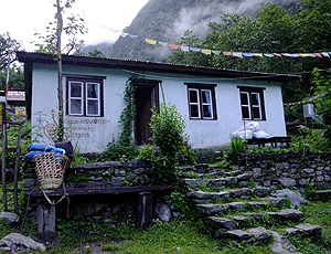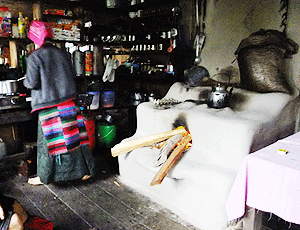 「下の村」で休憩 樹林の中は、花が少なく、 花がないと疲れが倍増 お店があったので、ミルクティーを頼んだ ヤクのミルクらしい 角が丸みを帯びた白いかまどで お湯を沸かしていた 外には、どーどーと水が流れていたので 顔と手を洗いさっぱり 土間はきれいに掃き清められ お店の人は入口で履物を脱ぎ、 はだしで歩いている 私たちは登山靴の土足 申し訳ない気分 |