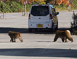 バス停で待っていると、 昨日登って行ったスキー場の斜面から降りてきた 2匹の猿が、悠々と車道を横切っていった 部屋の窓近くには、 『野生の猿が入ってきますので 鍵を掛けておいてください』という 注意書きの札の分けが、納得できた |