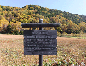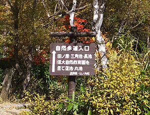 | 『熊が出没 ご注意!!』 こんな看板をあちこちで見た 特に、早朝と夕方に遭遇の危険がある・・・と 四十八池へのメインルートなので、 道はよく整備されている |