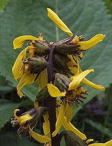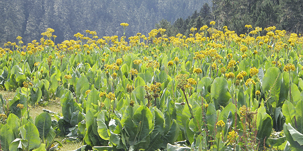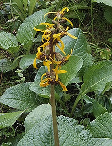 | キク科 梅里雪山ビューポイントホテル〜香格里拉(標高約3300m)間で オタカラコウに似ているが、花は天辺にかたまっている 葉は、ミズバショウみたいで大きい 背丈60〜80cm程 頭花の直径6cm程 |