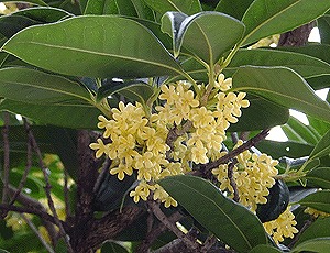 | モクセイ科 石鼓鎮で(標高約1850m) バスを降りたとたん、 い〜い匂いがする・・・と思ったのはこれ キンモクセイ(ギンモクセイより黄色く、 キンモクセイより薄い色) 背丈4m程 小さい花の直径5mm程 |