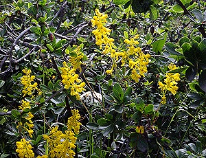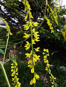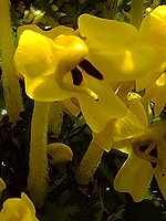 | 調べ中 梅里雪山ビューポイントホテルで(標高約3300m) 黄色いマメ科の花 しなだれていたので、手で支えながらパチリ 背丈60〜70cm程でヒョロヒョロしている 花の直径1cm程 |