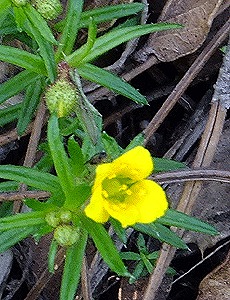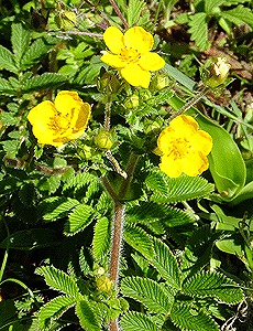 | 瀘沽湖で(標高約2700m) キジムシロの仲間かな? 葉が、『雉が座って休める莚のように きれいに広がって』いるという特徴に似ている 背丈10〜20cm程 花の直径2cm程 |