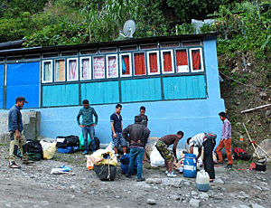 | 出発前のパッキング 青い樽(日本から持ってきた食糧が入っている)や 竹かごを担ぐのは、キッチンスタッフ トレッカーのバッグやテントなどを運ぶのは、ポーター |