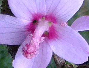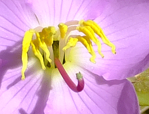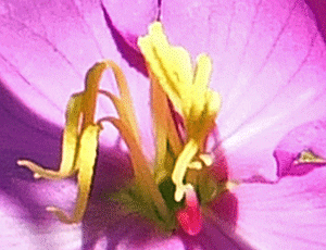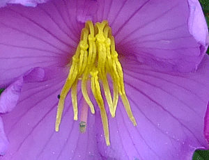 | オスベッキア ネパレンシス:ノボタン科 右 葯の拡大 こちらも花びらは4枚だが、 葯が「S」字になっていないので「オスベッキア ネパレンシス」となる |
