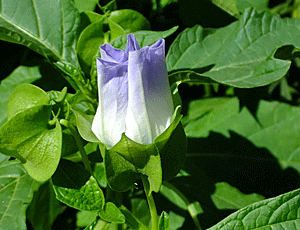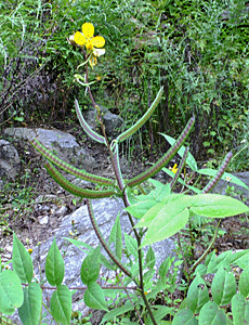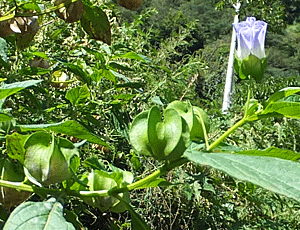| 薄紫の花で、面白い形の実をつけていた 実は、だんだん黄色になっていく |