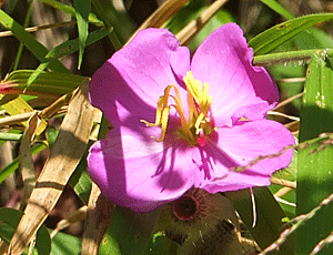 | オスベッキア ステラタ:ノボタン科 左 このは花びらが4枚で大柄 右 葯の拡大 『葯がS字になるものとそうでないモノで分ける』・・・と 上の画像の葯は「S」字なので「オスベッキア ステラタ」 |