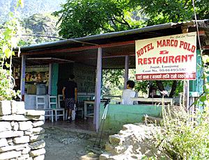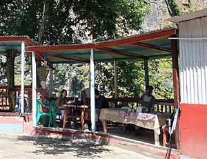 | 左 今日のランチ場所11:35着 小屋の後ろは川 右 キッチンスタッフが作ってくれたランチ 完食〜 食欲のあるうちは、大丈夫 隣の席に3名のフランス人トレッカーがいた そのうちの一人の前に運ばれてきたのは、大皿に山盛りのごはん 彼は、そのまま、何もおかずなしで、黙々と食べていた・・・驚いた! |