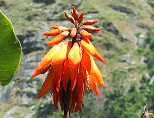 | 朱色の花が咲いた後には、マメ科の実そっくりの大きなさやがぶら下がっていた これがマメ科?? |