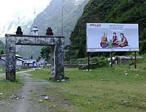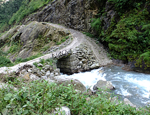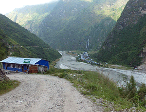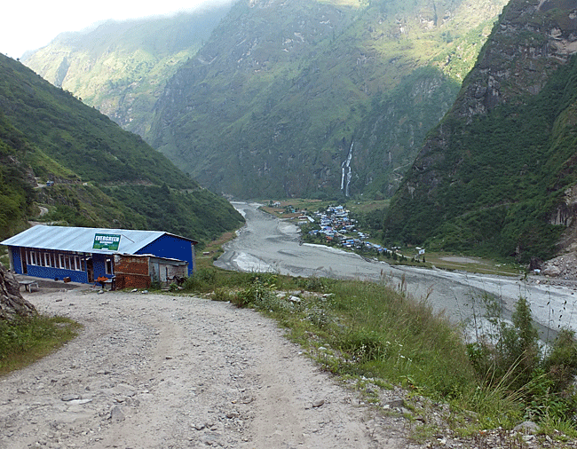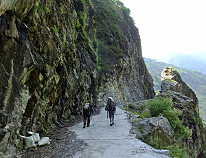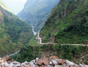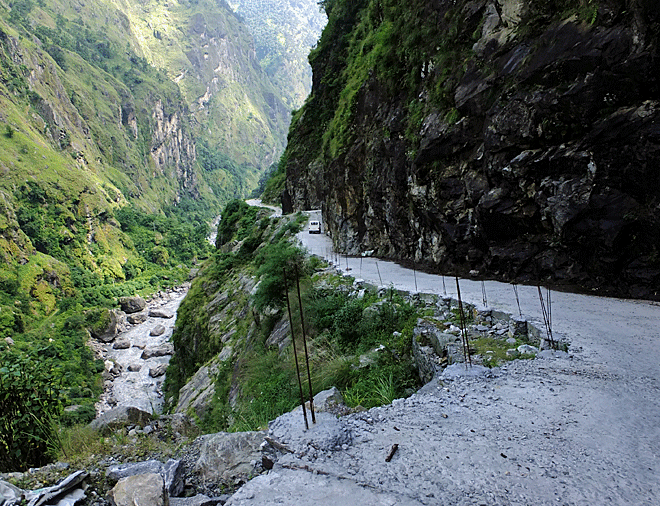 右下は川 こんな車道を延々と歩く 「アラウンドアンナプルナ」って、車道歩きだった?? 私の下調べが足りなかったらしい・・・ |