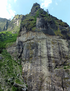 | 徐々に高度を上げて、あの岩壁を横切る道へ 後ろを振り返るが、後続の姿なし・・・ |