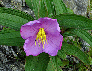 | オスベッキア ネパレンシス:ノボタン科 左 こちらは、5枚の花びらで、やや小柄 右 葯の拡大 葯が「S」字になっていないので「オスベッキア ネパレンシス」となる 花びらの枚数や花の大きさで決まるのではないそうである |