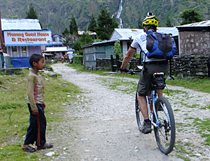 自転車隊がやってきた 彼らは、5461mのトロンパスを越え、 3750mのムクティナートを目指して駆け下りる 「ダウンヒル」が目的だとか |