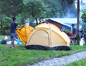 芝生の庭に、トレッカー用のテントを3つ張る 女性2人用で1張 男性2人用で1張 単独希望の男性用に1張 |