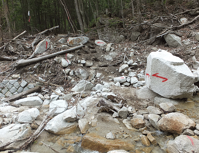 左折してしばらくたったころ、沢音が聞こえてきた えっ? もう金時ノ洞窟のある沢?…と思ったら 以前は小沢だったところが、大きな谷になっていた 大岩がゴロゴロし、立木が流された跡が 上流から下流までずっと続いていた 昨年7月の「南木曽岳豪雨」の痕らしい・・・と分かった 今は、歩きやすいように足場が作られ 赤ペンキが書いてあった |