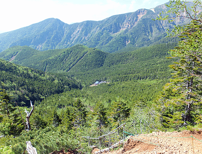 ずっと下に、行者小屋 バックは、左から峰の松目・硫黄岳・横岳 その奥に蓼科山がうっすら |