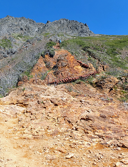 | うへ〜、また梯子の階段・・・ 稜線はまだまだ遠い・・・ 水なんて汲んでくるんじゃなかった・・・とか、バスの立ち通しが今頃影響が出てきたか・・・とか こんなんじゃ、北アルプス縦走は無理かも…なんて考えながら登る |