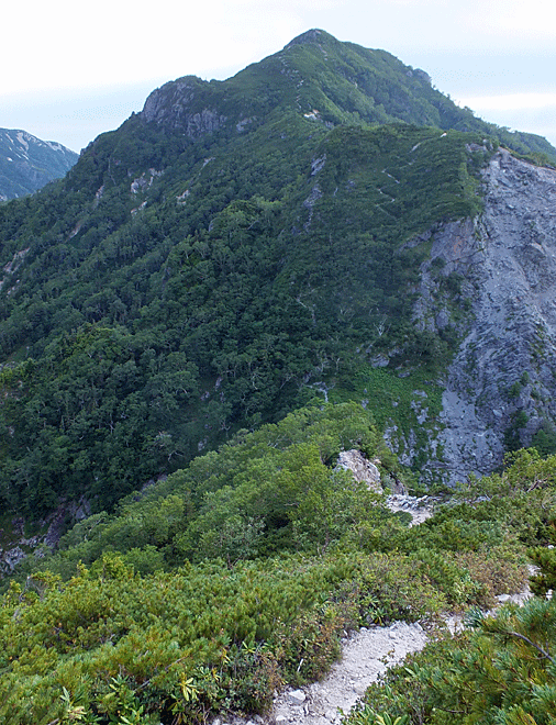 | 「蓮華の大下り」の最後かな? 逆コースなので「蓮華の大登り」になる 左奥に蓮華岳のなだらかな稜線が見える |