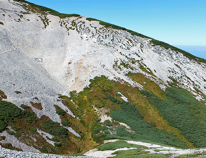 | 雪渓の上に黒い小さな点々 もしかして登山者???と思ってパチリ やっぱり、大雪渓を登って来る登山者たちだった 右 大雪渓を登り終えて、いったん土のある葱平(ねぶかっぴら)に上がり、 次は小雪渓を目指している所が小さく小さく見える |
