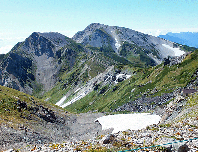 | 大雪渓の向こうに、杓子岳 もっと進むと、唐松・五竜・鹿島槍へとつながる 大雪渓の下の方に、白馬尻の小屋も見えた |