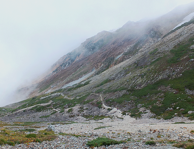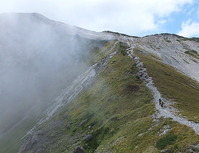 | 左からガスが登ってきて、展望が悪くなった あの稜線をどんどん下る |