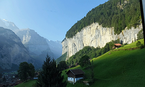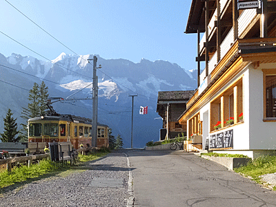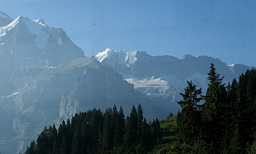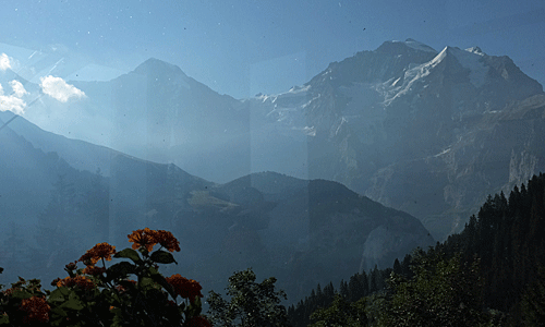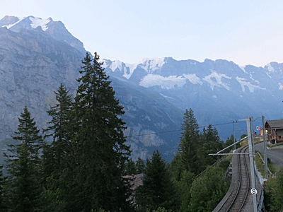 | 今度は山側の景色 ユングフラウ4158m(右)とメンヒ4107m(左) |