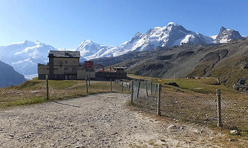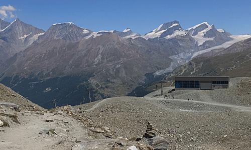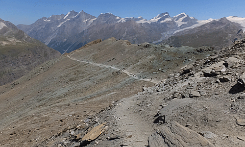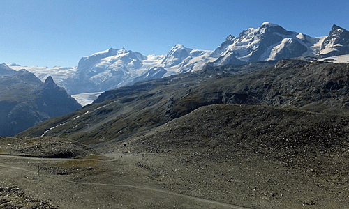 | 左手は、 モンテローザ・ブライトホルン・クラインマッターホルンだけは分かる 砂利採取場のような所歩いている ハイカーの姿も見えた 花は無さそうな道 |