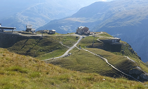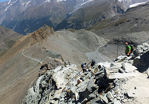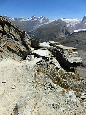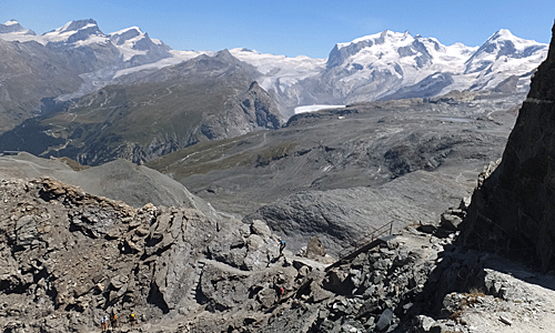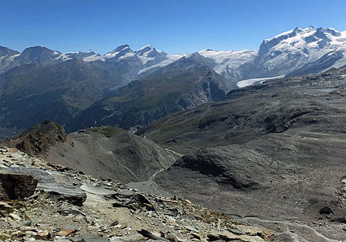 | 右の方に、クラインマッターホーンとブライトホルン 左は、モンテローザ いろんな道が入り組んで見えた |