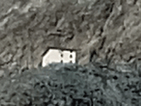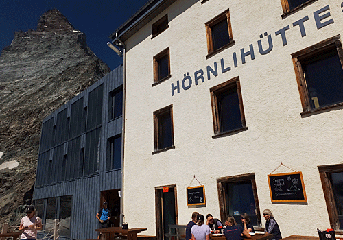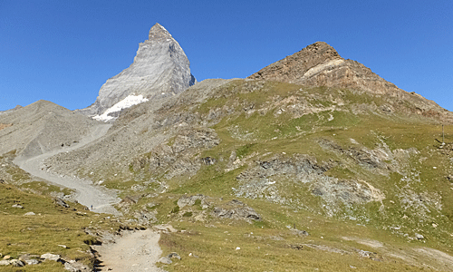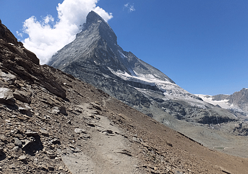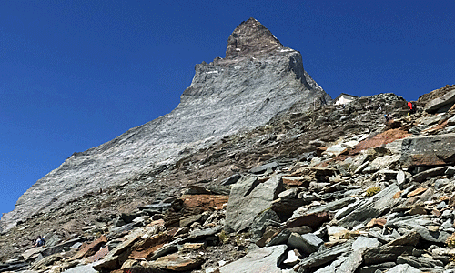 | マッターホルンがだんだん近づいてくる 目を凝らしてみると、白い建物(ヘルンリヒュッテ)が見えた(右の画像) まだまだ先は長い |