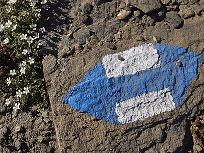 | 岩の上にもべったりと青白マーク でも、今日の様子を見ていると 殆んどハイカー 私と同じように、ヒュッテが目的地なんだね 白い花は、ナデシコ科:ツメクサの仲間 |